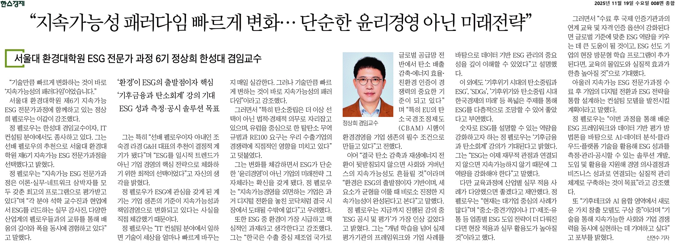 한스경제 릴레이 인터뷰 보도 (정상희 펠로우)