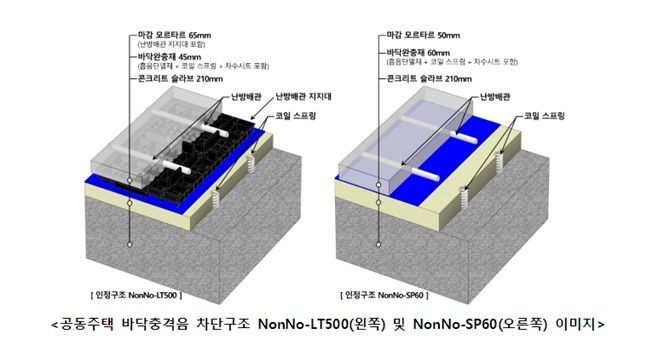 에너지뿐 아니라 생활 품질 문제인 층간소음 기술도 적극 개발 중이다. 롯데건설은 바닥 완충재에 방진용 금속 코일 스프링을 적용한 구조로 한국건설기술연구원에서 중량·경량 충격음 모두 1등급을 획득했다. 진동 흡수력이 높은 금속 스프링을 활용해 바닥 두께(320mm)는 그대로 유지하면서 소음 차단을 강화한 방식이다.