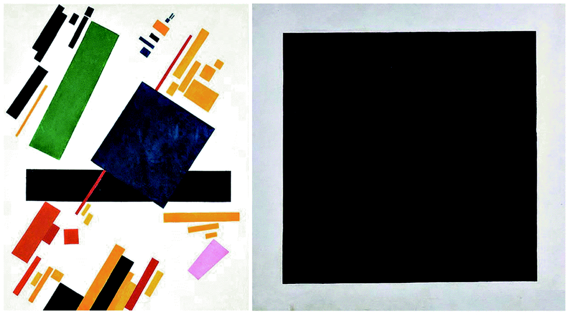 러시아 미술작품 중에서 가장 비싼가격에 거래된 말레비치의 1916년 작 '절대주의 구성 회화'(왼쪽)와 1915년 절대주의의 탄생을 알린 '검은 사각형'.