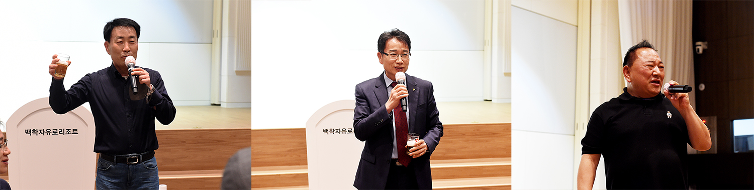 저녁만찬 자리에서 인사말을 하고 있는 정순표 한스경제 대표이사님, 박종민 연천군 부군수님, 이현수 원우회장님