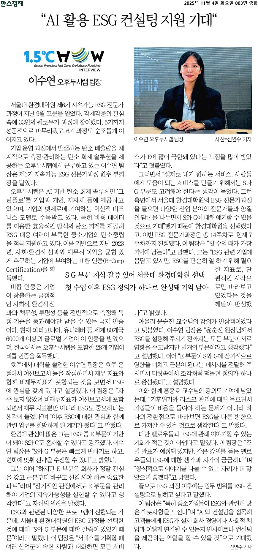 한스경제 릴레이 인터뷰 보도 (이수연 펠로우)