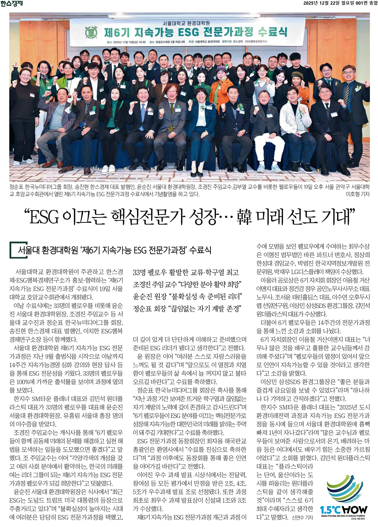 [지면보도] 제6기 지속가능 ESG 전문가과정 수료식