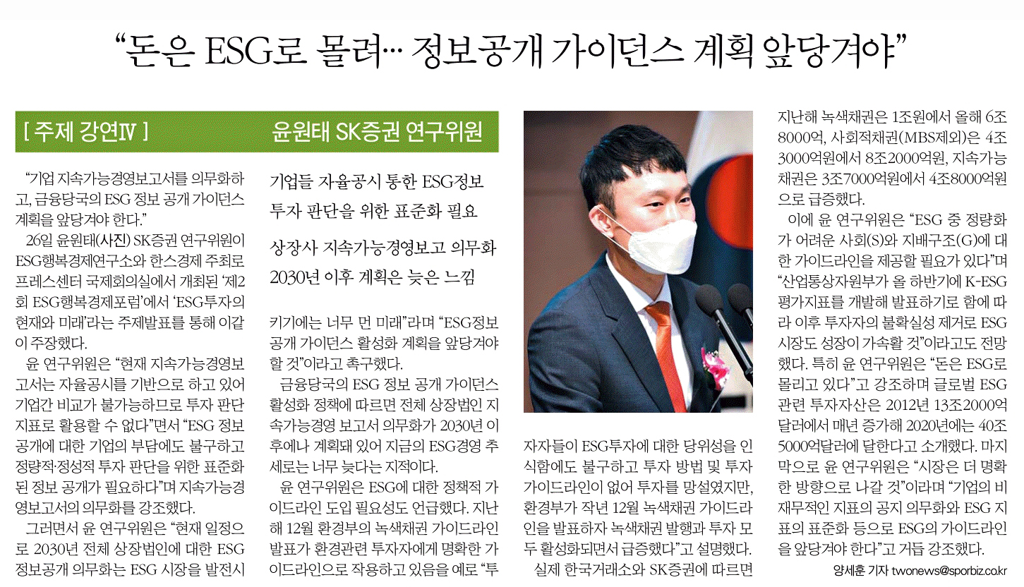 윤원태 SK증권 연구위원 주제강연 "ESG 투자의 현재와 미래"