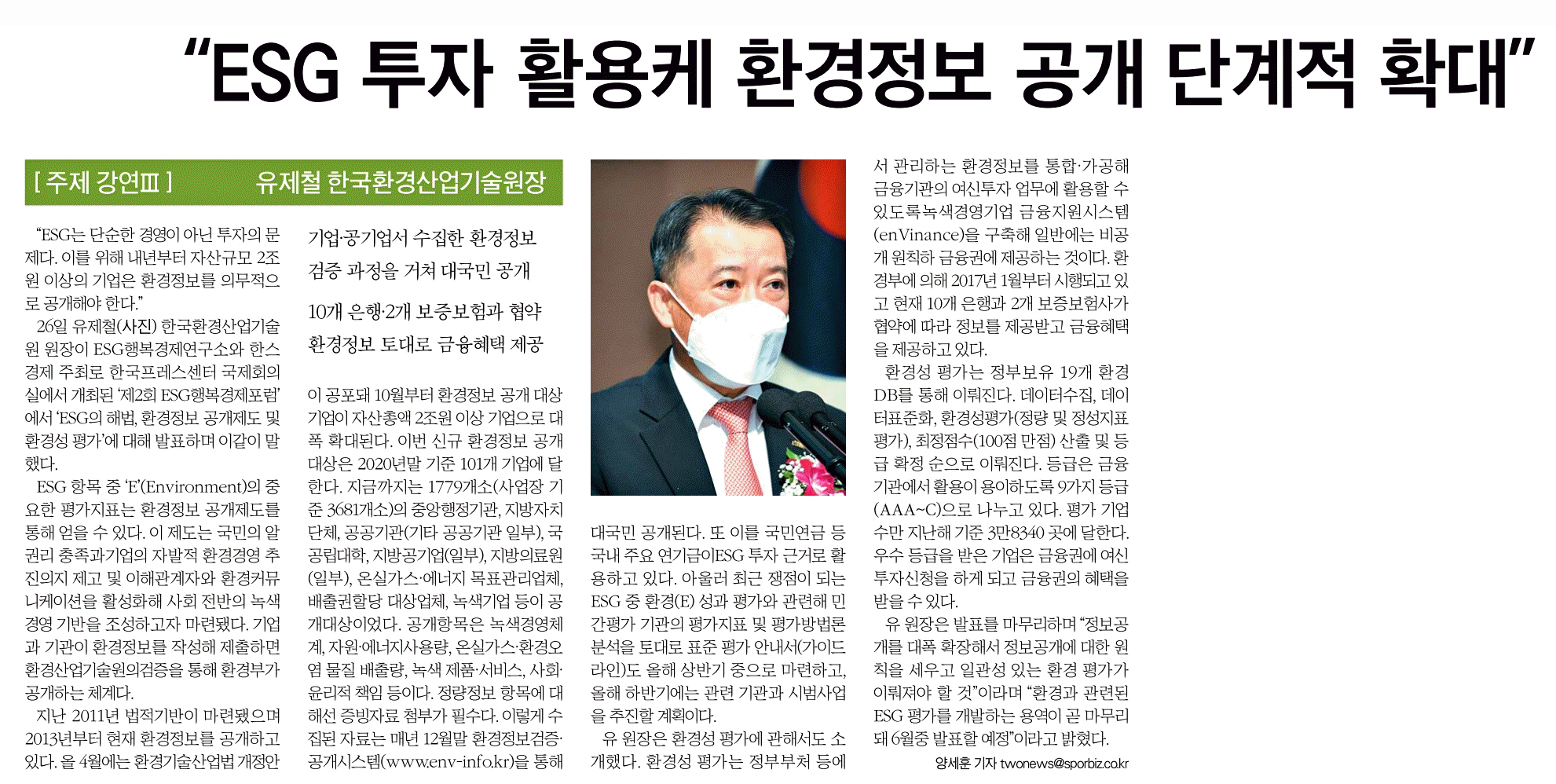 유제철 한국환경산업기술원장 주제강연 "ESG의 해법, 환경정보공개제도 및 환경성 평가"